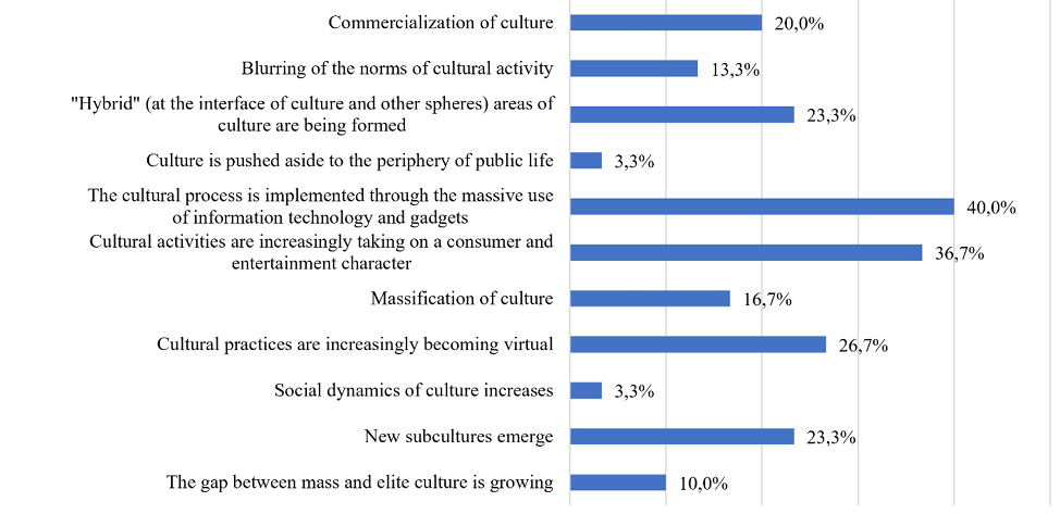 A substantial part of the interviewed experts vividly registers the procedures related to the hybridization and technologization of culture. Forty percent of participants stated the substantial utilization of information technologies and tools as the most substantial alterations in the sphere, and 23.3% - the formation of hybrid culture areas (Figure 2).
