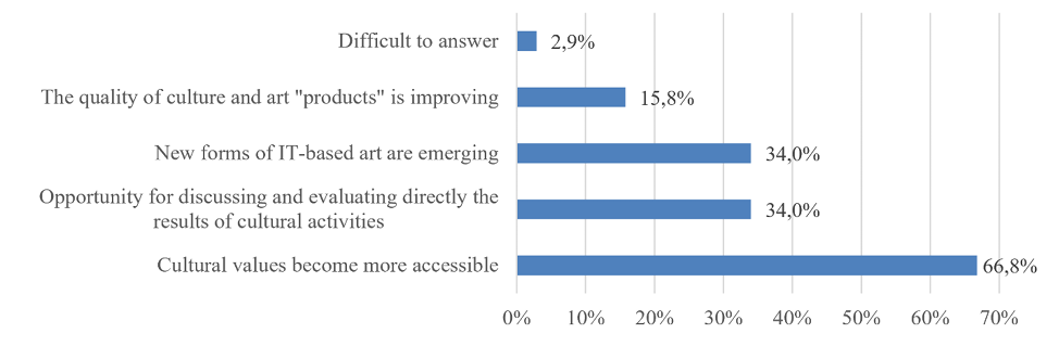 The participants who accept the favorable effect of technical tools on the cultural procedure in the city (nearly half of them - 48.20%), associated that primarily with a rise in the abundance of cultural values (66.80%), supplying a chance to directly evaluate and discuss the outcomes of cultural tasks (34.00%), the appearance of new kinds of art on the basis of information technologies (34.00%) (Figure 4).