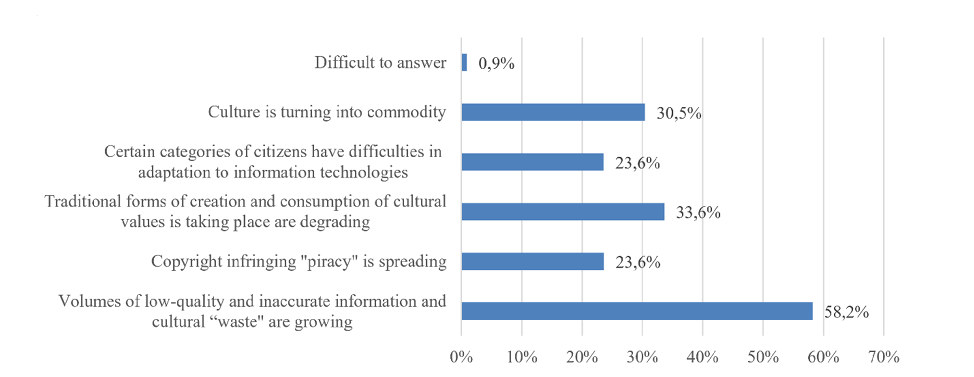The portion of participants who adversely evaluate the effect of technical tools on the cultural procedures in the urban area equaled these giving positive evaluation (44.00%). The primary argument has been the reality that technologization outcomes in the increasing volumes of unreliable and poor-quality data «cultural waste» (58.20%). The next adverse results were also referred to: degradation of conventional forms of consumption and creation of cultural values (33.60%); change of culture into a commodities (30.50%). Roughly one quarter mentioned the outbreak of «piracy» that infringes on copyright, and also problems in adjusting to information technologies for some citizens groups (Figure 5).