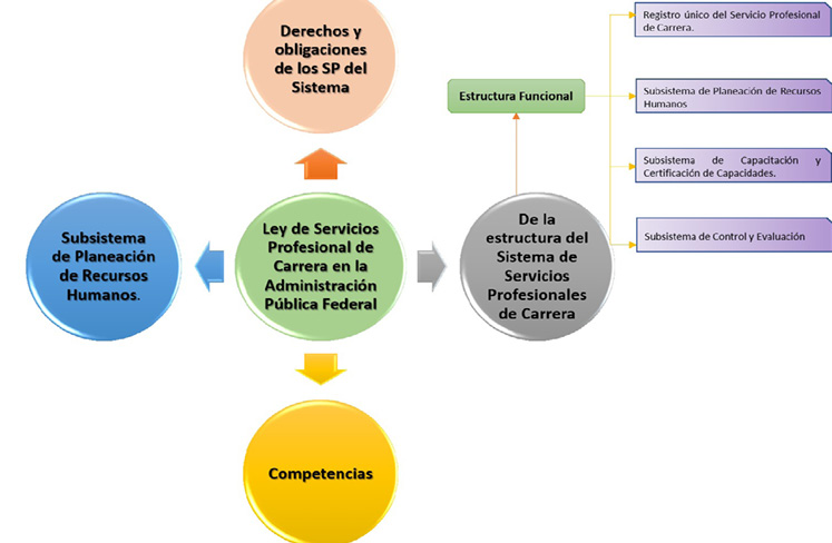 La siguiente figura muestra de qué manera la Ley de Servicios Profesional de Carrera en la Administración Pública Federal (LSPCAPF) impacta al aplicarla en las instituciones gubernamentales, donde sus pilares bases son las Competencias, los derechos y obligaciones de profesional de carrera en la administración pública, subsistema de planeación de Recursos Humanos, de estructura de los servicios del SP.