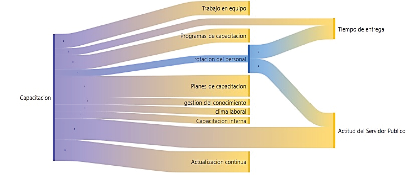 En el diagrama de Sankey, se puede observar que en la categoría Capacitación la subcategoría que mas influyen es la Actitud del Servidor Público, debido a que al recibir la capacitación el SP, la actitud juega un papel importante para aplicar lo aprendido a sus actividades relacionadas con la Armonización Contable; de tal manera que la subcategoría que analizamos en la investigación que es la de Rotación del personal; donde la actitud del SP de alto mando es positiva, tendrá la capacidad de crear estrategias para poder enfrentar la rotación de personal, ya sea por termino de periodo administrativo, por cambio de puesto, por despido por alguna otra razón que hace que el personal clave que tiene la experiencia y conocimiento se hayan ido de la institución o departamento.