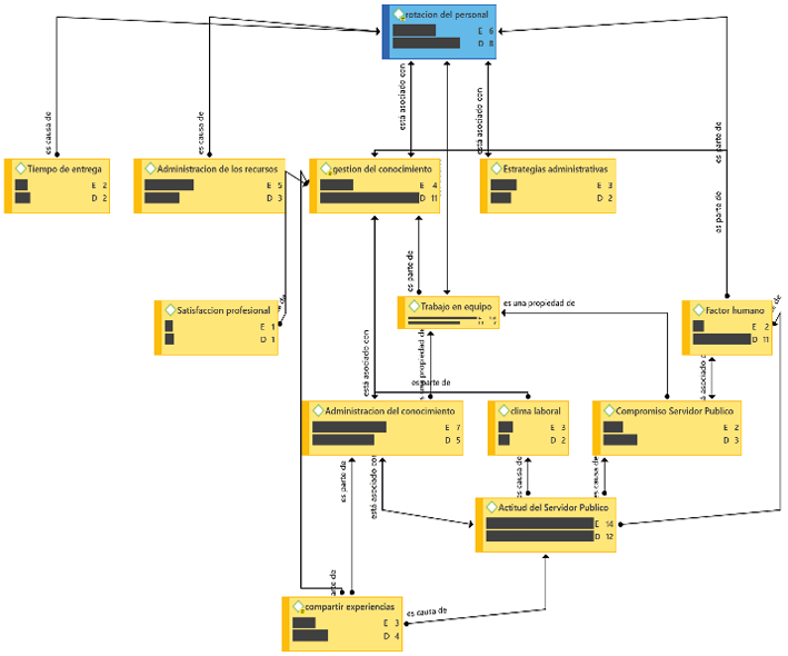 Para la interpretación de los resultados se muestra el diagrama de Sankey, el cual nos sirve de apoyo para poder interpretar mejor la co-ocurrencias entre cada una de las categorías; por lo que el diagrama de Sankey en donde nos muestra que para poder impactar de manera positiva a los procesos de Armonización Contable necesario contar con la Actitud positiva del Servidor Público, a su vez nos permita administrar el conocimiento de aquellos SP que tengan mayor experiencia en la ejecución de la Armonización de los procesos Contables y Financieros; mediante programas y planes de capacitación interna, realizando las tareas mediante el trabajo en equipo, a su vez evitar la Rotación del personal clave con experiencia; sin embargo se podrá utilizar la rotación de personal como estrategia, siempre y cuando sea para garantizar la administración del conocimiento del SP con experiencia y mejorar el proceso de Armonización Contable.