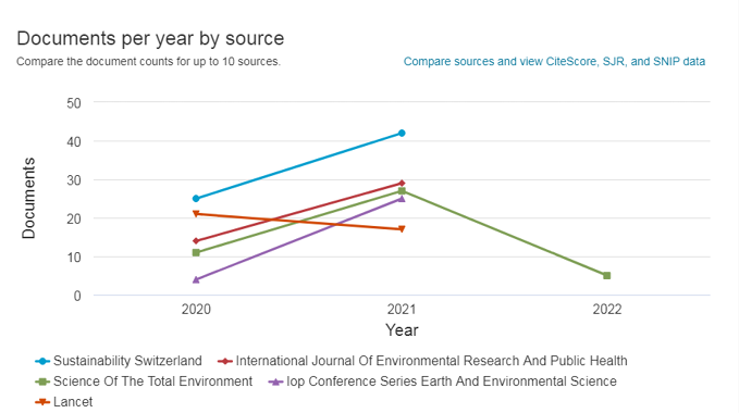 Las publicaciones que se analizaron fueron: Sustentabilidad Suiza, Diario Internacional de Investigación Ambiental y Salud Pública, Ciencia del Ambiente Total, Series de Conferencias Iop de Ciencia Ambiental y Tierra, Lancet. (traducción propia).