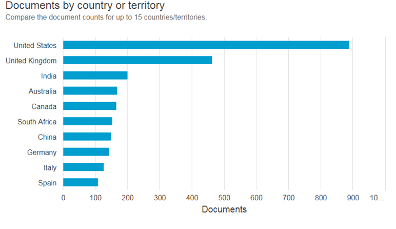 Número de documentos del rango 0 a 900 de Estados Unidos, Reino Unido, India, Australia, Canadá, Sudáfrica, China, Alemania, Italia y España.