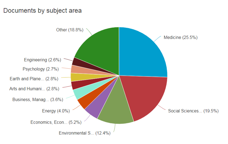 Medicina y Ciencias sociales son las áreas con mayor porcentaje comparado con el total de publicaciones relacionadas de la temática abordada en este segundo avance.