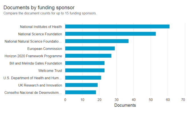 Gráfica 7. Comparativo de la cantidad de documentos publicados con los patrocinadores del financiamiento. El mayor número de documentos fueron patrocinados por Institutos Nacionales de Salud.