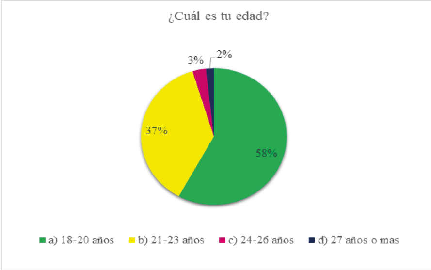 Se observa que el 58% de las encuestadas se encuentran en el intervalo de edad de 18 a 20 años, seguido por el rango de edad de 21 a 23 años representado por el 37% de las encuestadas; lo anterior responde al hecho de que pertenecen al sistema escolarizado, ya que si se tratara del sistema semiescolarizado, los rangos de edad serían en su mayoría distintos, pues por lo regular, son personas que interrumpieron la continuidad de sus estudios formales por diversas situaciones principalmente económicas y familiares.