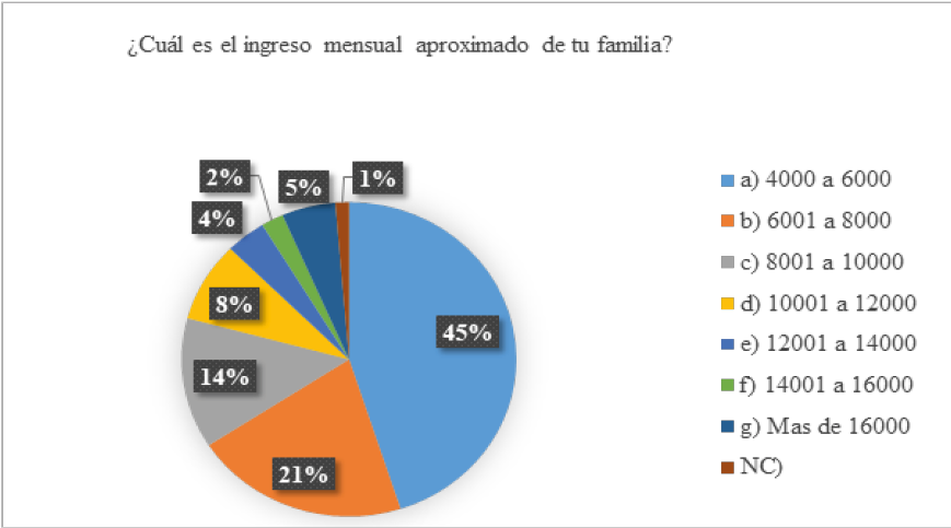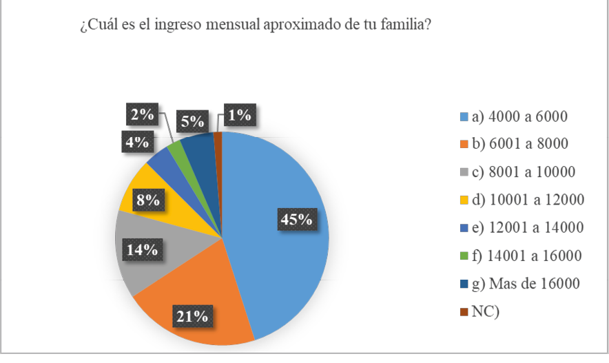 Se observa que el 45% de las encuestadas declara que el ingreso familiar se encuentra entre los $4,000 y $6,000 en contraposición con el 5% que su ingreso familiar asciende a más de $16,000. En segundo lugar, la respuesta con mayor frecuencia fue el rango de ingreso de $6,001 a 8,000. El 14% declaró que su ingreso familiar es de $8001 a 10,000.