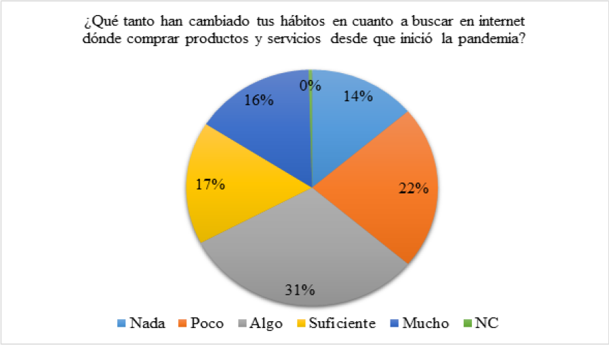 Queda de manifiesto que la pandemia orilló a que un gran índice de consumidores se viera obligado a cambiar sus procesos de compra. Las estudiantes de la UPCH no fueron la excepción, ya que se observa que el 16% de ellas, declararon que desde que inició la pandemia, y con esto, las restricciones del gobierno en cuanto a los horarios de atención al cliente e incluso el cierre total de algunos puntos de venta, cambiaron en mucho sus hábitos de búsqueda de información en internet sobre dónde adquirir sus productos o servicios; en contraposición el 14% manifiesta que no cambiaron nada sus hábitos de búsqueda de información en internet, lo que no significa que no lo hiciera antes de la pandemia.