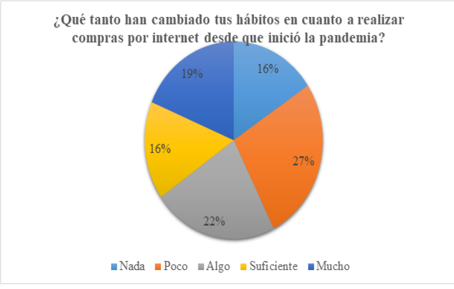 Como puede notarse, un 19% de las encuestadas cambiaron en mucho sus hábitos en cuanto a realizar compras por internet a raíz de las restricciones gubernamentales por la pandemia. Es de destacar que asciende a 84% el total de encuestadas que consideran hubo cambios en sus compras por internet en la valoración de muchos hasta pocos cambios experimentados.