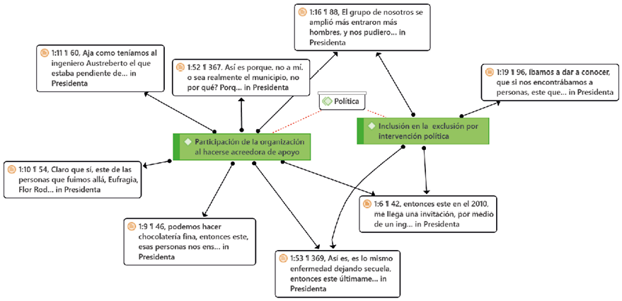 De este modo, queda claro que los problemas internos de la organización hasta el tiempo que fue caracterizada, causaron bajos rendimientos en su capacidad operativa, sin que ello permitiera el logro y consolidación de proyectos colaborativos. Un ejemplo establecido con su entorno fue la participación de la CFDY con entidades educativas, de gobierno, otras cooperativas, productores de cacao y empresario de Venezuela por mencionar; lo anterior, podría ser explicado aún, a pesar de que la organización CFDY no esté legalmente constituida, sobre ello Rodríguez & Opazo (2017, p. 28) explican que “a diferencia de otros enfoques de análisis, desde la perspectiva de Luhmann, ni la formalidad ni la informalidad juegan un papel especial en la construcción de los límites de una organización. Así también, Rodríguez & Opazo (2017, p. 28) señalan que “las decisiones de una organización se pueden reconocer incluso sin que tengan un efecto conectivo legal”. De esta forma resulta comprensible dar cuenta de los rendimientos que la organización rural CFDY alcanzó a pesar de no encontrarse legalmente constituida, los programas de gobierno como SEDESOL y PROSPERA permitieron la inclusión de las demandas de la organización rural CFDY.