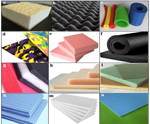 Figure 1. Thermoset and thermoplastic polymeric foams: (a) Spray polyurethane foam, (b) Acoustic polyurethane foam, (c) Silicone foam, (d) Cellulose acetate foam, (e) phenol foam, (f) Elastomeric rubber foam, (g) Polyethylene foam, (h) Polypropylene foam, (i) Polyvinyl chloride foam, (k) Polystyrene (XPS) foam, (m) Polystyrene (EPS) foam, (n)ABS foam [4]