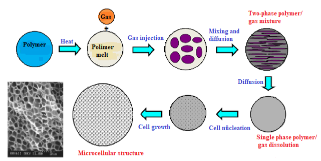 The foaming process takes place in two basic steps, which are bubble nucleation and growth. A new phase (bubble phase) is produced in the nucleation step from the initially homogeneous polymer-gas mixture. The bubble nuclei develop into final bubbles in the growth step. Both steps are affected by many physical properties such as viscosity, gas solubility, surface tension and glass transition temperature [11,13].