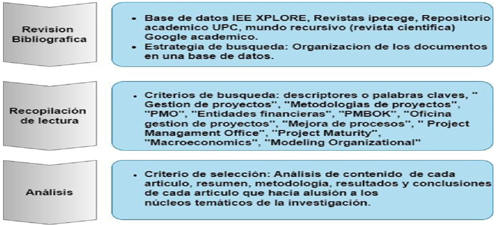 Una vez seleccionadas las bases de datos, se eligieron los descriptores o palabras clave. Como criterios de búsqueda, se incluyeron los siguientes descriptores: “Gestión de proyectos”, “Metodología de proyectos”, “PMO”, “Entidades Financieras”, “PMBOK”, “Oficina gestión de proyectos”, mejora de procesos”, “Project managament office”, “project maturity, macroeconomics”, “Modeling Organizational”.
