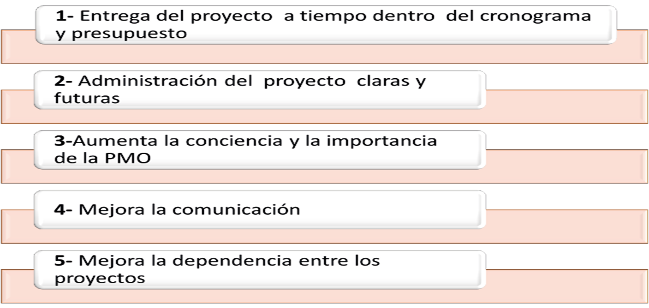 Los beneficios planteados generan en una organización altos beneficios, creando imagen de una organización más eficiente en su trabajo, aumentando la probabilidad de éxito y rentabilidad, generando la ampliación de mercado, nuevas oportunidades y satisfacción de los clientes, esta a su vez establece una metodologías y parámetros en los cuales se van a desarrollar los proyectos, en la figura 5 se destacan los beneficios que se esperan de una PMO.