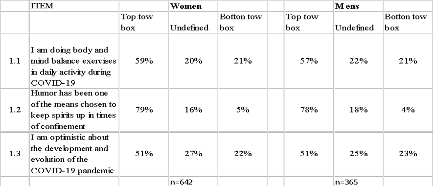A result to highlight is that humor has been one of the means chosen to maintain mood in times of confinement, where there was a 79% positive response. This data is significant because when the research was carried out, people had only been in confinement for three months.