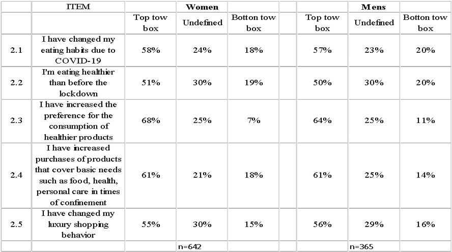 The daily coexistence to which individuals were subjected because of the confinement produced by the COVID-19 pandemic, made the behaviors of men and women similar, both sexes made changes to improve health and stay physically and mentally healthy, as mentioned by Sheth (2020), the context of coexistence, awareness and well-being, make behaviors change and adapt to the circumstances to which individuals are subjected, in this case to the daily coexistence caused by the pandemic, which makes households have a consumption of healthier products; likewise, as also mentioned by Sheth (2020), events that man does not control such as the COVID-19 pandemic, have modified consumption, the production of goods and services and the supply chain around the world. the situation due to the different variables and mutations and waves of contagion of COVID-19, has changed attitudes towards the pandemic, finding that today people around the world make demonstrations for the weariness and rejection of the confinement measures that governments have maintained.