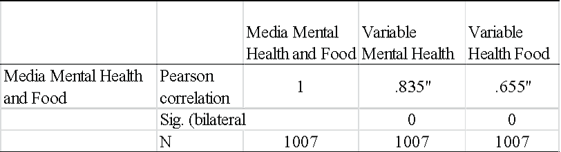 In an analysis of correlations (Pearson), based on the mean mental health and food of p = 3.57 and mental health of 3.63 and health food of 3.47. It was found that there is a high positive linear correlation in the relationship of (mean) health by food and exercise with (mean) mental health of p = .835 with a significance of 0.00. And in the relationship with food there is a moderate positive linear correlation of p=.655 (see Table 4).