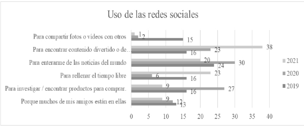 Sin embargo, como se puede observar en el año 2020, en el cual se implementó el distanciamiento social y se limitó el contacto físico, la tendencia fue 3 a 4 horas al día; tal comportamiento se mantuvo en el año 2021, como se expone en la Gráfica 1. Esta disminución en el uso de las redes pudiera deberse a que, por el encierro, los cursos de la universidad en esas etapas fueron dados online o de forma hibrida y por ende, los alumnos tuvieron menos tiempo libre para usar las redes sociales.