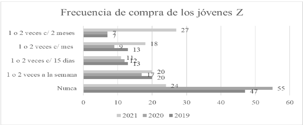 La frecuencia de compra de los jóvenes Z fue baja en los años 2019 y 2020, al mostrar que “nunca realizaban compras” virtuales en un 47-55% de los casos, lo cual es entendible, debido a que estos jóvenes dependen para gastar de sus padres o tutores. Sin embargo, en el 2021 se redujo significativamente el “nunca compro” a 24% (o sea un 76% si realizó compras por internet) al realizarlas de manera digital al menos de 1 a 2 veces cada mes o cada 2 meses en el año 2021. Por otro lado, llama la atención el incremento de consumo en los productos deportivos; quizás esta actividad es la que restó parte del tiempo que anteriormente invertían en navegar en las redes sociales, al comenzar a realizar ejercicio en casa. En adición, las clases virtuales o híbridas de la Universidad, también restaron tiempo al uso dedicado a las redes sociales.