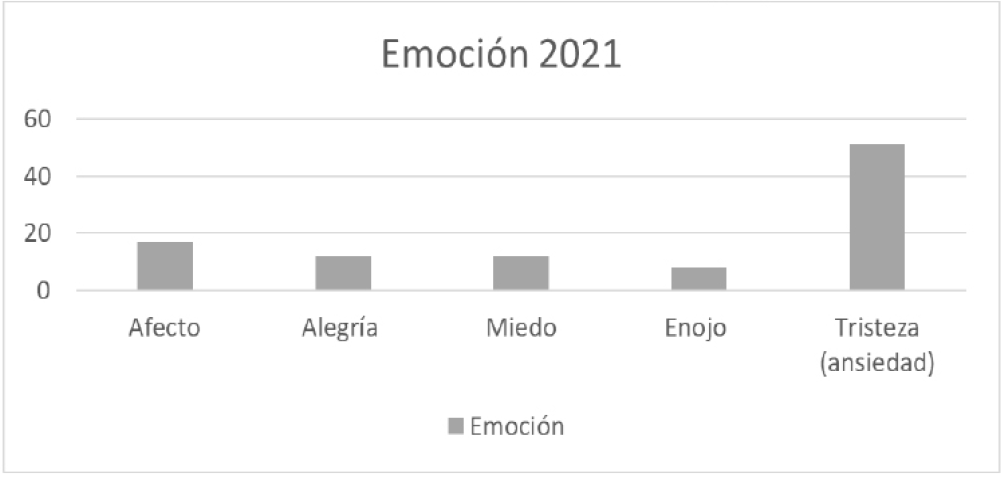 La emoción que predominó en los jóvenes Z durante el aislamiento social (Covid-19) fue “la tristeza” (ansiedad) en un 50% de los casos, predominando con ello más los sentimientos negativos (tristeza, ansiedad, enojo y miedo) que los positivos (afecto y alegría) como indica la Gráfica 10. Esto tiene importantes implicaciones para los educadores de las universidades y para los mismos padres para contrarrestar estos sentimientos de abatimiento en los jóvenes de esa generación.