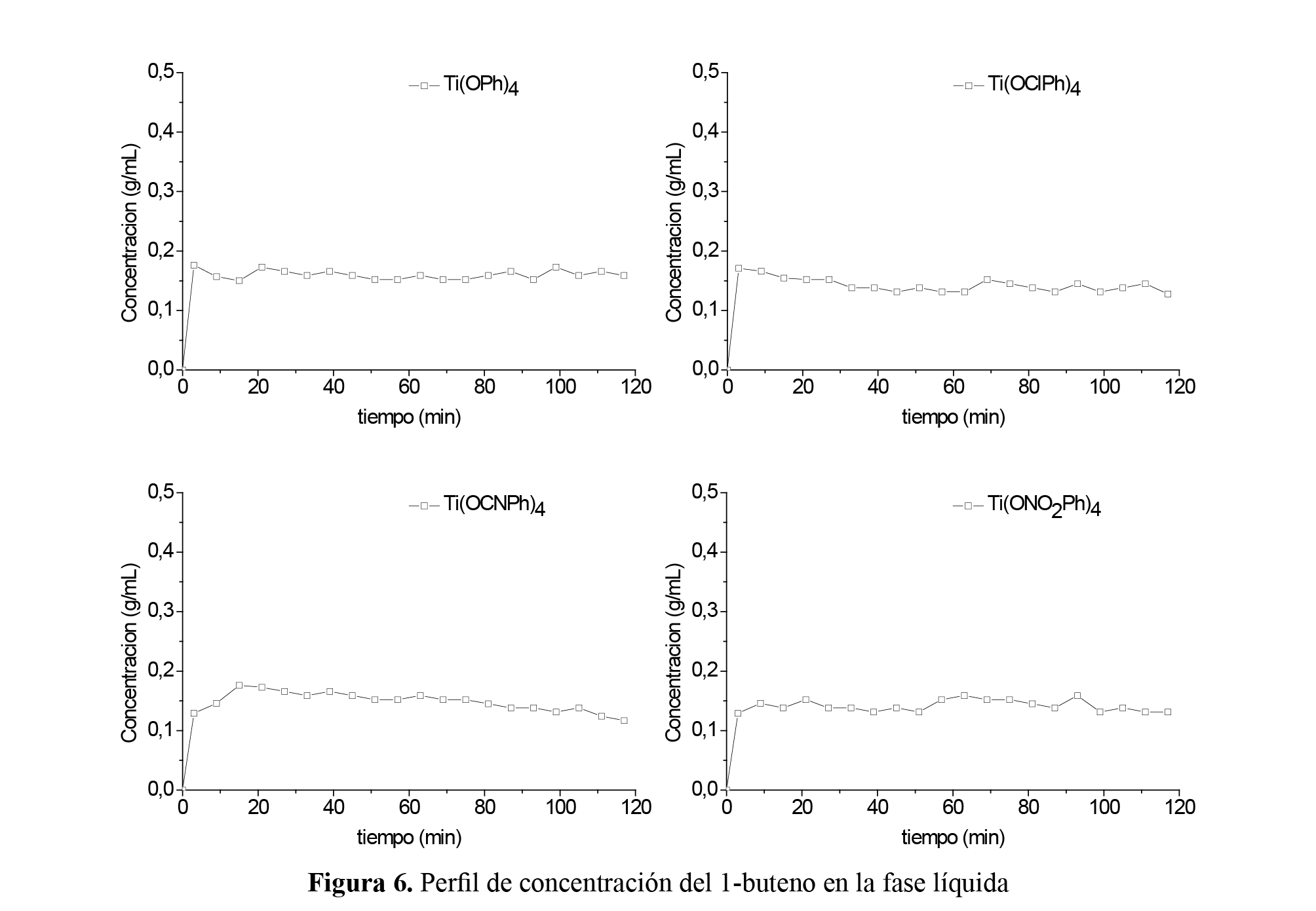 Todos los catalizadores presentaron actividad en la reacción de dimerización de etileno con selectividad hacia 1-buteno del 100%. Sin embargo, el gran impedimento estérico que poseen los tetrafenóxidos de Ti influyó en los resultados catalíticos, reflejado en una menor actividad comparado con el butóxido de Ti. Adicionalmente, el aumento en la fuerza sustractora de densidad electrónica del grupo en la posición 4 influyó en dichos resultados catalíticos, probablemente por la estabilidad energética que gana el enlace Ti-OAr en su forma octaédrica al incluir sustractores de densidad electrónica en el anillo aromático.