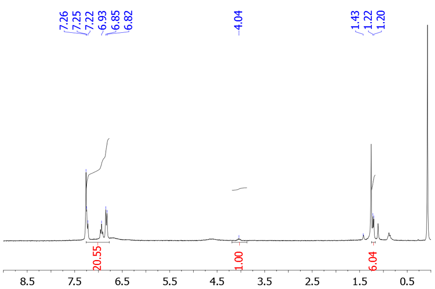 El espectro 1H NMR correspondiente al tetrafenóxido de Ti se presenta en la Figura 1. Se observa a 4.04 ppm una señal debida a los hidrógenos metino del isopropanol ligado con el Ti y entre 7.26 - 6.82 ppm a los hidrógenos aromáticos. De acuerdo a los resultados obtenidos, la relación entre hidrógenos aromáticos, hidrógenos secundarios e hidrógenos primarios evidencian un buen ajuste con respecto al valor teórico.