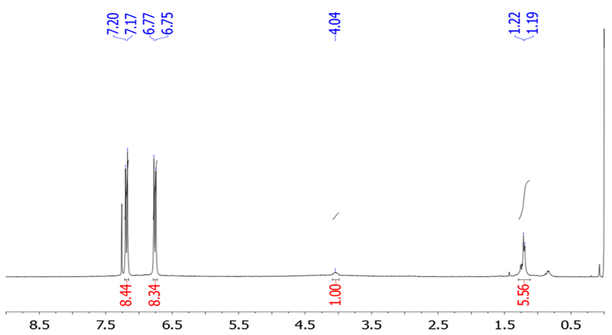Sólido color naranja. 1H NMR (300MHz, CDCl3): δ=7.18 (8 H, meta); δ=6.76 ppm (8 H, orto); δ=4.04 ppm (br., 1H, CHMe2); δ=1.20 ppm (d, 6H, CHMe2).
