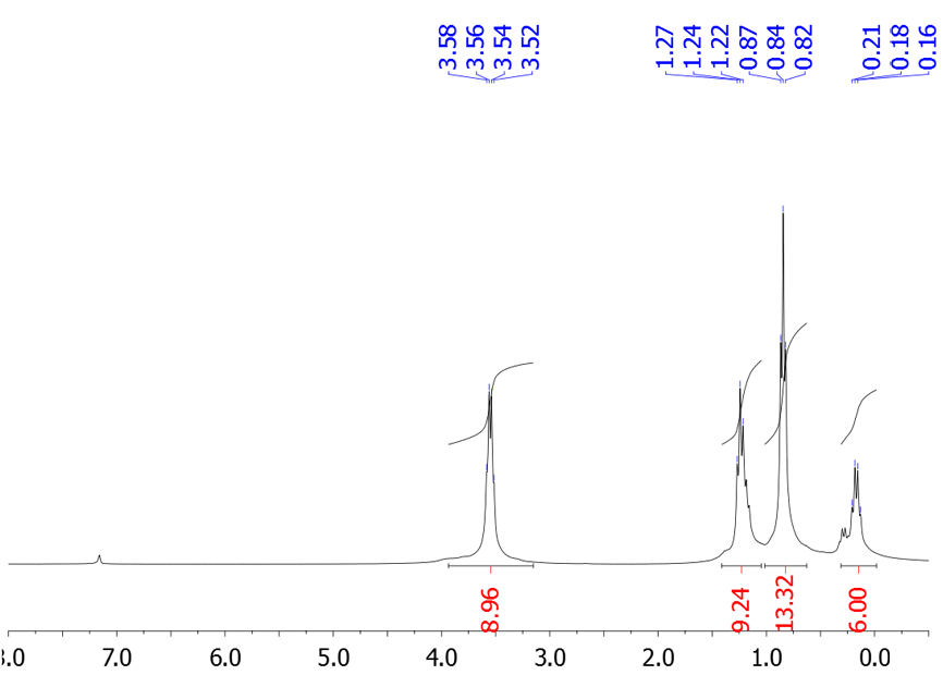 El espectro 1H NMR correspondiente al trietilaluminio eterado (Et3Al OEt2) se presenta en la Figura 3. Se observan cuatro señales asignadas a los hidrógenos metilenos (δ=3.55 ppm) y a los metílicos (δ=0.84 ppm) del éter. Adicionalmente, se observan señales atribuidas a los hidrógenos metilenos (δ=0.17 ppm) y metílicos (δ=1.24 ppm) del trietilaluminio. De acuerdo a los cálculos de áreas, se observa una relación 2:3 entre los hidrógenos metilenos y los metílicos, respectivamente; lo que es consistente con la estructura del trietilaluminio eterado. Adicionalmente, el resultado obtenido da evidencia que el método de ultrasonido permitió obtener bajo condiciones suaves el trietilaluminio para su posterior uso como co-catalizador.