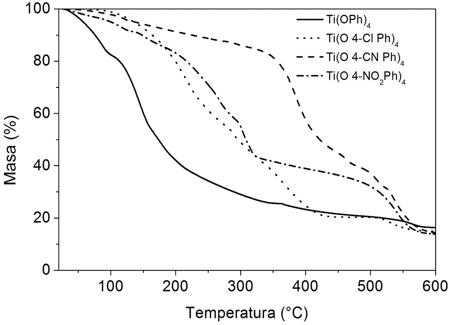 Los tetrafenóxidos de titanio se caracterizaron mediante análisis térmico (Figura 4), donde se observa en todos los pre-catalizadores pérdida de material volátil debido a los isopropanoles y grupos fenóxidos ligados al titanio desde 30°C a 600°C. Los compuestos de titanio sustituidos también muestran una menor pérdida de peso que el Ti(OPh)4 entre temperatura ambiente y 200°C, atribuido al aumento del carácter iónico del enlace Ti-O que genera los grupos sustractores de densidad electrónica.
