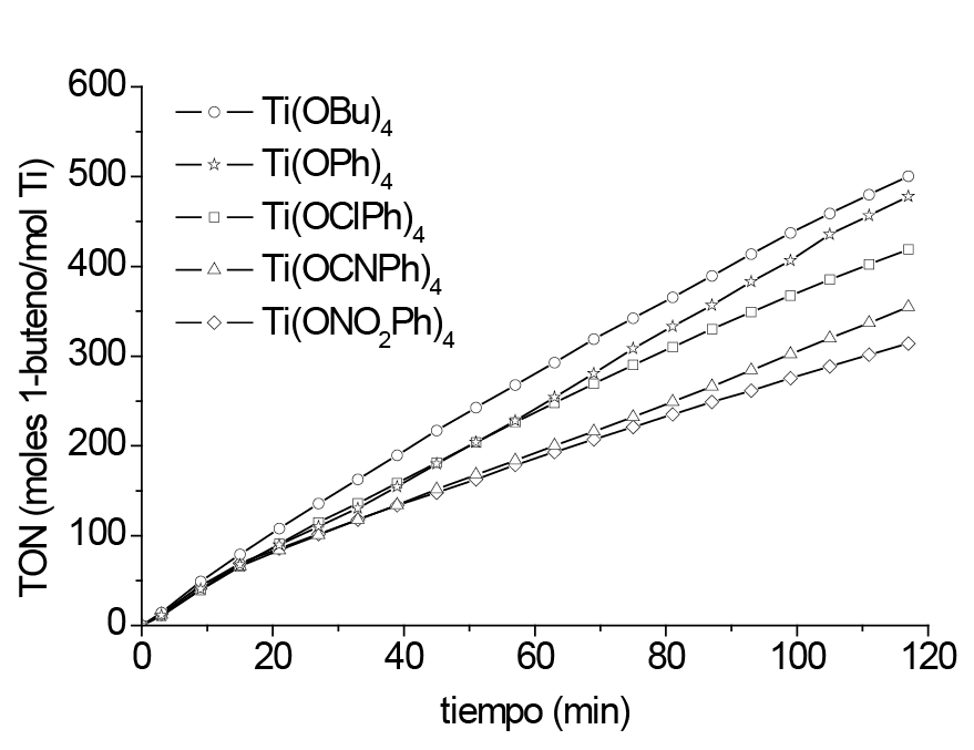 Las medidas de actividad se realizaron en términos de productividad del catalizador, turnover number (TON), definido como mol de 1-buteno producido por mol de Ti.