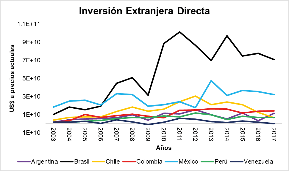 Figura 1: Inversión Extranjera Directa (IED) recibida en algunos países de América Latina 2003-2017