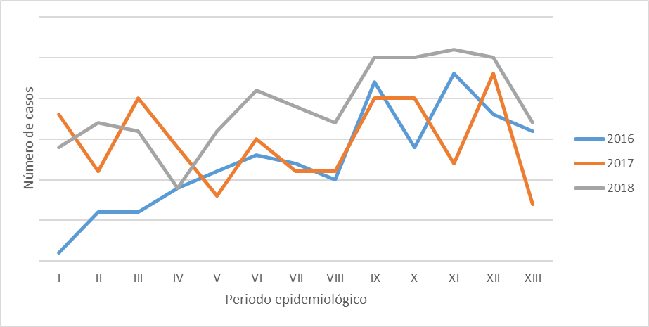 Según el periodo epidemiológico en los años analizados la tendencia fue creciente para los periodos IX y XII. Con un amento de ocurrencia para el año 2018. (Ver Gráfica 1).