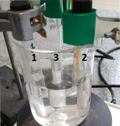 Fase de adaptación biológica. A los siete días de incubación se observó en todos los tubos con caldo medio mínimo de sales con petróleo crudo al 1% v/v, cambio de color, apreciándose en las muestras 1 y 2 mayor turbidez y aparición de un color café claro, con respecto a la muestra 3 (Figura 2).