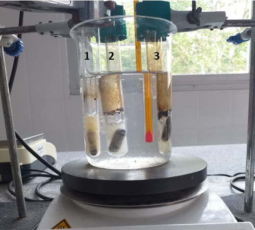 Fase de adaptación biológica. Se estimuló el crecimiento microbiano tomando un mililitro de caldo de preadaptación, para hacer una dilución 1/10 con caldo medio mínimo de sales con petróleo crudo al 1% v/v, en un tubo de ensayo tapa rosca. El caldo enriquecido, se preparó con sales grado reactivo, K2HPO4: 1.5g/L; KH2PO4: 0.5g/L; (NH4)2SO4: 0.5g/L; NaCl: 0.5g/L; FeSO4: 0.002g/L, (modificado de Echeverri et al., 2010; y Narváez et al., 2008) mezclado con 1000 mL de agua destilada y suplementado con petróleo crudo al 1% v/v. El petróleo crudo fue suministrado por el laboratorio de Microbiología del CCAV Cartagena – UNAD. Las muestras fueron incubadas a 35°C por siete días empleando una plancha magnética de calentamiento a 35°C, con agitación magnética y verificación de la temperatura mediante el uso de un termómetro de mercurio (Echeverri et al., 2010; Narváez et al., 2008).
