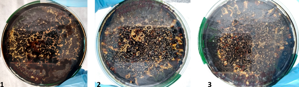 Figura 3. Colonias en agar nutritivo con petróleo crudo al 1% p/v obtenidas de las tres muestras de agua