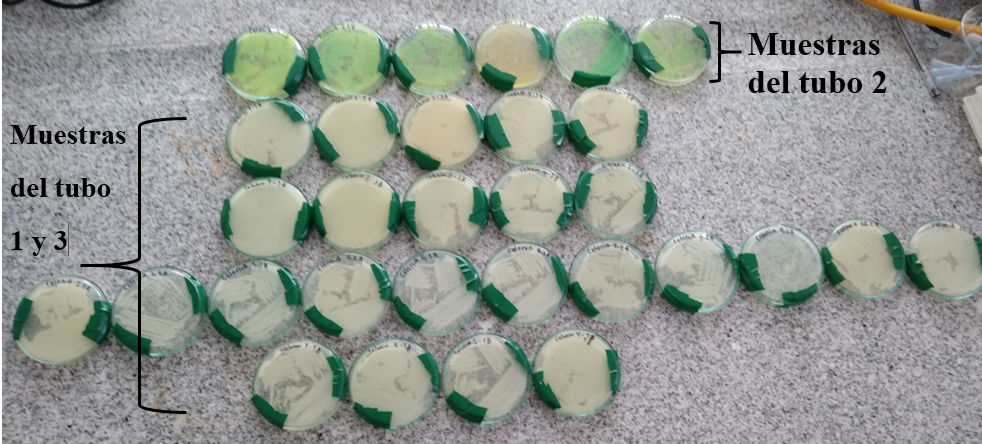 De las colonias sembradas por aislamiento en agar nutritivo (Figura 4), de las tres muestras, solo las de la muestra 2 produjeron un cambio en el color ambar normal del medio de cultivo hacia uno ligeramente ocre.