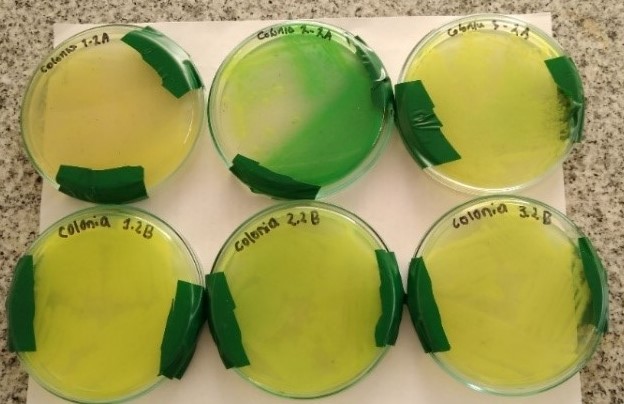 También se resalta que una de las cajas de la muestra del tubo 2, presentó mayor pigmentación verde, indicando la presencia presuntiva de Pseudomona fluorescens y P. aeruginosa de acuerdo a las instrucciones de la casa comercial (Scharlab Grupo de Abastecimiento de Laboratorio, 2020 y Bio-Rad, 2020) (Figura 6), sin embargo se establece que aunque los demás morfotipos de la muestra 2, no presentaron mayor pigmentación verde, no significa que no sea posible la presencia de P. fluorescens y P. aeruginosa, debido a una baja producción de pioverdina.