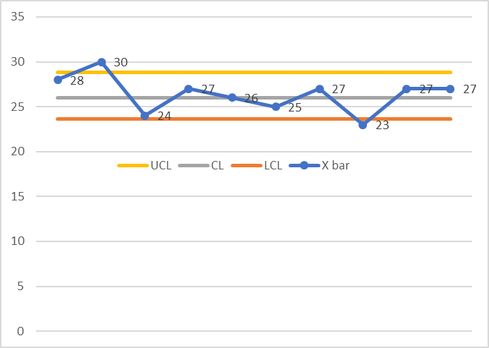 At first glance it can be seen that the process is out of control. The points of the second and third sample mean are located outside the upper limit and the point of the octave sample average exceeds the lower limit. To demonstrate a process in control it is necessary that the time range in the medical consultation varies between 24 and 29 minutes, with an average of 26 minutes. (See Figure .2)