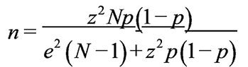 Donde n es el tamaño de la muestra, N es el tamaño de la población universo, z es el valor cuantil-normal para el nivel de confianza, e es el margen de y p es la proporción óptima para estimación de parámetros. De lo anterior, con el 95% de confianza, bajo el supuesto de un muestreo aleatorio simple y para una proporción de valor 0.5 con un margen de error teórico de ± 3%, el diseño descrito proporcionará alrededor de 89 cuestionarios efectivos.