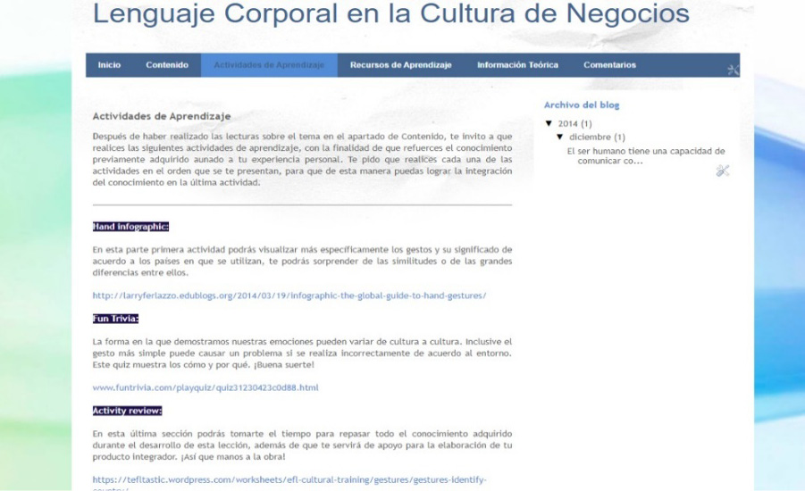 La plataforma cuenta con los siguientes materiales precargados: videos cortos relacionados a los gestos y lenguaje corporal en las distintas culturas y en la cultura de los negocios como valor agregado.