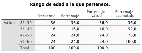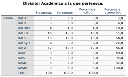 De los 100 participantes 39 cuentan con nivel de licenciatura, 4 con especialidad, 26 con maestría y 31 con doctorado (Ver Tabla 3). La mayor participación fue de la división DACEA con 45 participantes, seguido por DACS con 13 y DAEA con 12 participantes, 6 de DACSyH, 5 de DAIS, 4 de DACBIOL, y 3 participantes en cada una de las siguientes divisiones: DACA, DACB, DAIA, DAMC y DAMR (Ver Tabla 4), entre los 21 – 60 años (Ver Tabla 5), de los cuales el 48% estaba conformado por hombres y un 52% por mujeres (Ver Tabla 6 ).