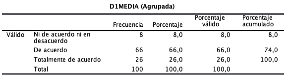 Para el caso de la dimensión 1 (actitudes), los encuestados proporcionaron las siguientes respuestas: El 66% indicó la opción número 4 (De acuerdo), el 26% prefirió la número 5 (Totalmente de acuerdo), mientras que el 8% de los encuestados optó por la respuesta número 3 (Ni de acuerdo ni en desacuerdo) (Ver Tabla 8).