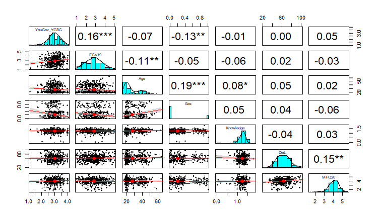 We found that health behavior has a positive correlation with Fear (r = 0.16, p<.001) and negative with Gender (r = -0.13, p<.01). There is no statistic significant between Heath Behavior and Age, Cognitive, Quality of Life, Moral Foundation (p>.05).
