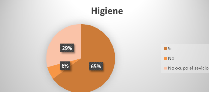 Interpretación: se observa en la gráfica que de las personas encuestadas el 65% respondió que Si está satisfecho con la higiene de la habitación, el 65 dijo que No y el 29% respondieron que no ocupo el servicio. (Gráfico 1.2).