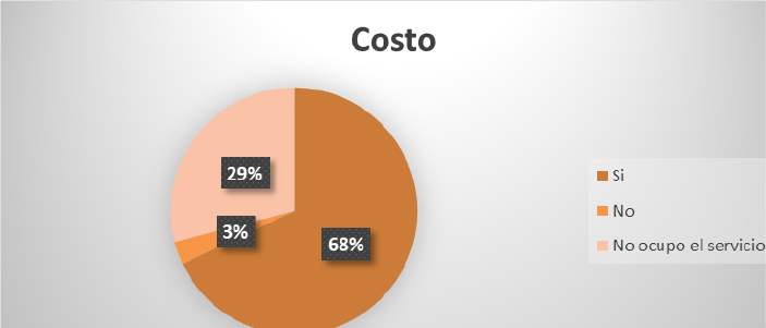 Interpretación: en el gráfico se observa que de las personas encuestadas el 68% dijo que Si está de acuerdo con el costo del hospedaje, el 3% respondió que No está en acuerdo respecto al costo y el 29% respondió que no ocuparon el servicio. (Gráfico 1.4).