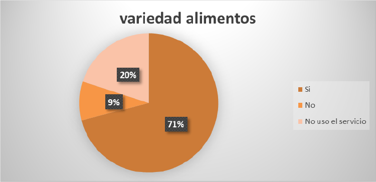 Interpretación: el 71% de las personas encuestadas respondieron que Si están satisfechos con la variedad de alimentos que contiene el menú, el 9% respondió que No está satisfecho y el 20% no consumió alimentos. (Gráfico 2.2).