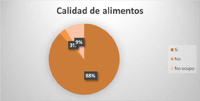 Interpretación: se puede observar en la gráfica que el 88% de los encuestados respondieron que Si es satisfactoria la calidad de los alimentos, el 3% respondió que No y el 9% No consumieron en el restaurante (Gráfico 2.4).