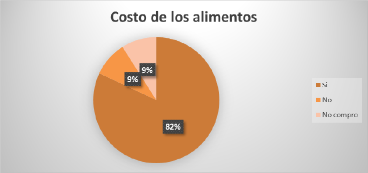 Interpretación: De las personas que consumieron en el restaurante, un 82% dijo que Si está de acuerdo con el costo de los alimentos, el 9 % dijo no es justo el costo y otro 9% no compró nada en el restaurante (Gráfico 2.6).