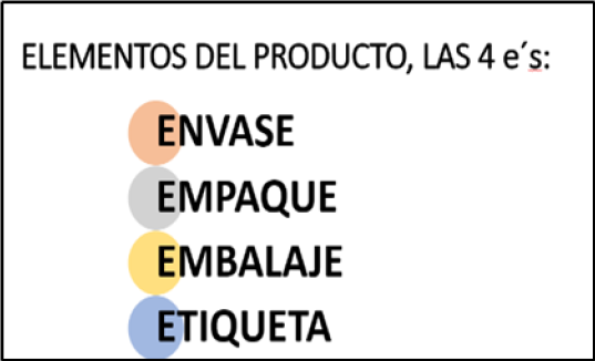 Dentro de los elementos del producto, se definen a las 4 e´s, formados por el envase, el empaque, el embalaje y la etiqueta.